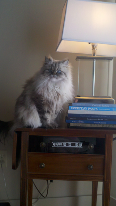 “1. My lynx point himalayan cat, Toulouse, sitting on a vintage radio/side table that I found in my grandparents’ attic and had restored. And yes, it still works!