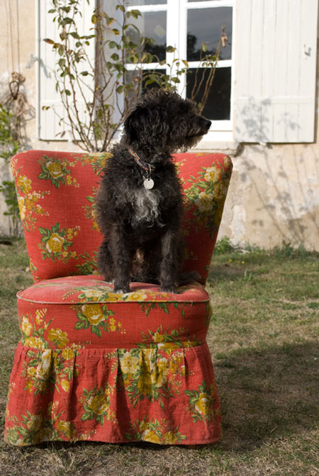 “This is ‘Puce’ (meaning ‘Flea’ in French) my parents little dog in Cognac, France. Here he is sitting on this lovely little chair in the garden of their home.”