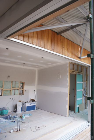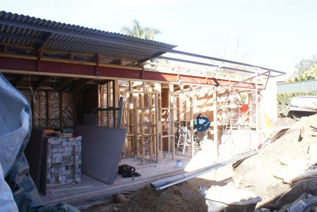 (This is) a great home in Rozelle where we demolished the back half of a three bedroom pokey workers cottage (May 2010) and are now well over six months into construction (mid-October) with handover beginning of December. The brief was to provide open plan living, dining and a linear kitchen that intersected the dining room, separate laundry, guest wc and bathroom. Provide three bedrooms (office/study) to the ground floor and a fourth bedroom and secret ensuite with timber staircase up to the first floor.
