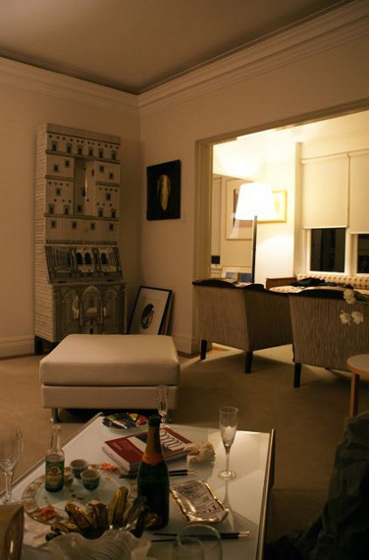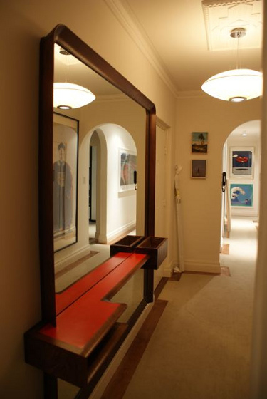 I thought I would give you an update (on) the Point Piper apartment… I have emailed you earlier during it’s progress (you can see our post here)and finally we have just completed the dining room table and the finer soft furnishings (joinery pelmet sand silk curtains). We designed all the built-in joinery that harks back to Art Deco but with our usual whimsical touches and the Client has now hung their artwork and provided that next layer of making it feel like a glamorous home. It’s such a joy to hand a project over to a Client that is not afraid to come on a journey with us and allow exploration of cost-effective materials ($20 glazed tiles) and laminate internal carcasses in rich colours (aubergine). I will let you know when it comes out… early next year.