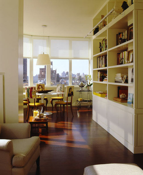 Jo is off taking care of the move to her new home (YAY!!) and I’m here taking care of business. To end off the work week, I wanted to share the work of New York interior design shop MH Studio. The M is for Shari Markbreiter, who “brings a fresh energy to traditional luxury. Her inspired blending of color, form and texture produce consistently sophisticated and comfortable interiors“. The H is for Benjamin Huntington, who has over 20 years of training in the art of Feng Shui. Together they create wonderful spaces, and I love how they utilize every inch of space (which in New York is necessary).