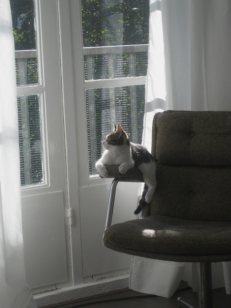 I just bought a small apartment in the centre of Amsterdam and a small kitten to accompany it. Here you see 4 month old Billie relaxing on the arm rest of one of the two Exquis chairs (a brand apparently unknown on the internet) I bought from marketplace (the Dutch craiglist).