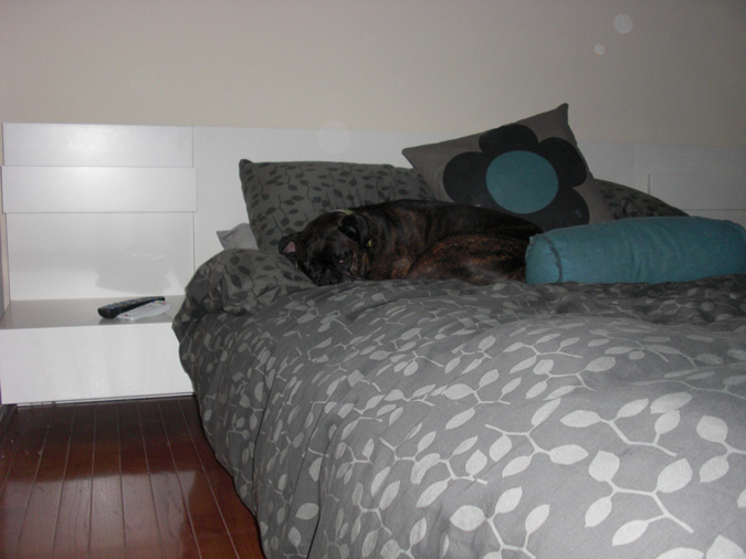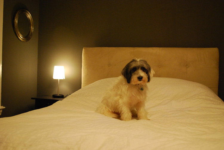 This is Bailey, at night she often disappears into other rooms in our house.  I can usually find her on the couch in the living room or snuggling up in the guest room.  She also likes to rearrange blankets and pillows to suit her comfort.