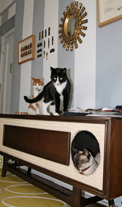 These are my 3 cats: Aldo, who is an 18-year old stray Siamese that jumped into my arms on a rainy day on the street; Chaplin, the tuxedo and Artos, the orange cat; both of them rescues, also. Aldo has recently discovered the cubbyhole that I cut into the sideboard. The sideboard/chest used to be a mid-century music cabinet, which I found on the curb. I gutted the interior and where the speakers used to be, cut out a hole and lined it with fleece. It makes for a little cat-cave and my cats take turns to claim it. I recently painted the walls with stripes and adding the key-collection to make the entry-hall look like a curio-cabinet.”