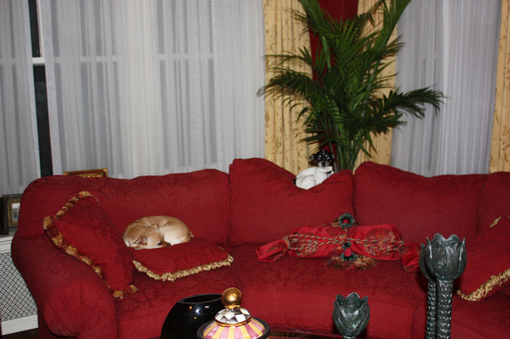 Here are two pictures of my chihuahuas Lilly (tan) and Miloh (black and white). They are perched in their favorite spot in the formal living room at my parent’s house.