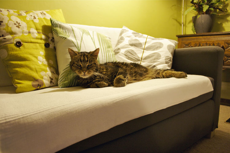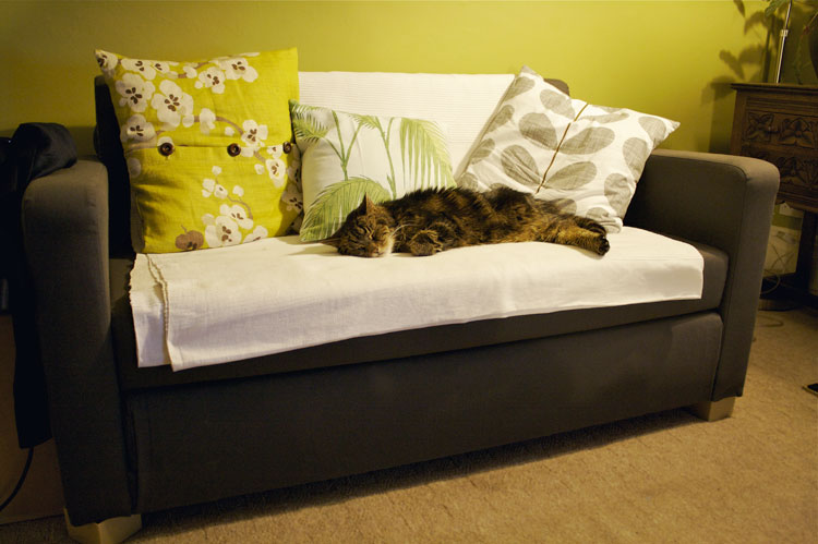 This is our 19 year old cat Ollie making himself at home amongst our cushions. The clicking camera woke him up and he wasn’t very happy!