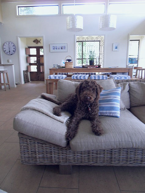 just had to share a pic of our labradoodle with you… her name is Amici ( a- mee- chee )… she has a coat as long as your pooch but I’ve just cut her with a pair of humans hair clippers :-)… it sort of worked !… we have another Labradoodle too… a big cream colour one  called Marcello… but he’s the good dog… he doesn’t sit on the furniture !