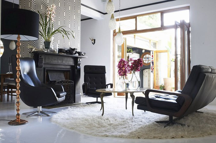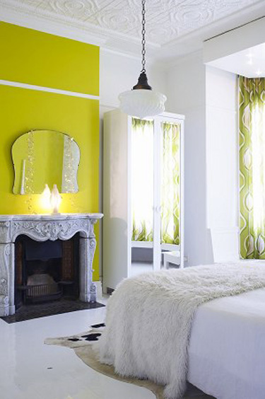 I think the black fireplace with the black and white wallpaper is gorgeous. I am also loving the white fireplace with the chartreuse paint. My most favorite thing is the wicker sofa, but all the photos are beautiful and inspiring. Thanks.