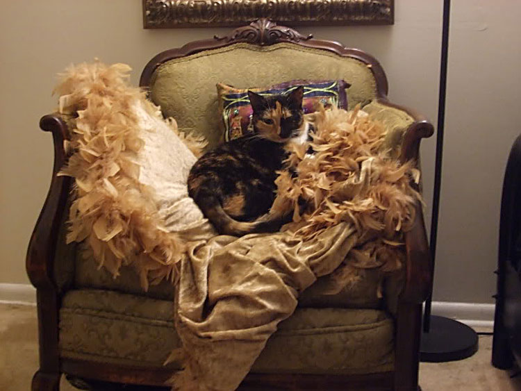 “This is my 8-yr-old cat Gizmo sitting on a beautiful chair that I inherited from my grandmother.”
