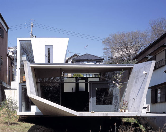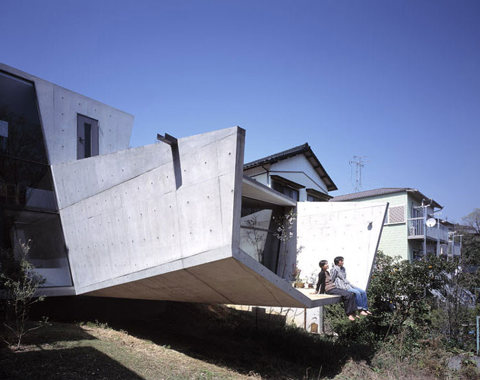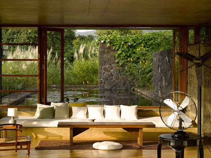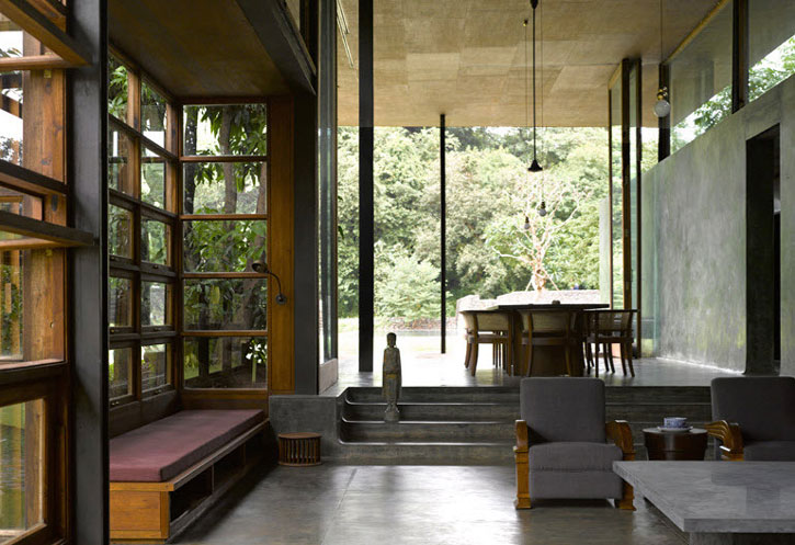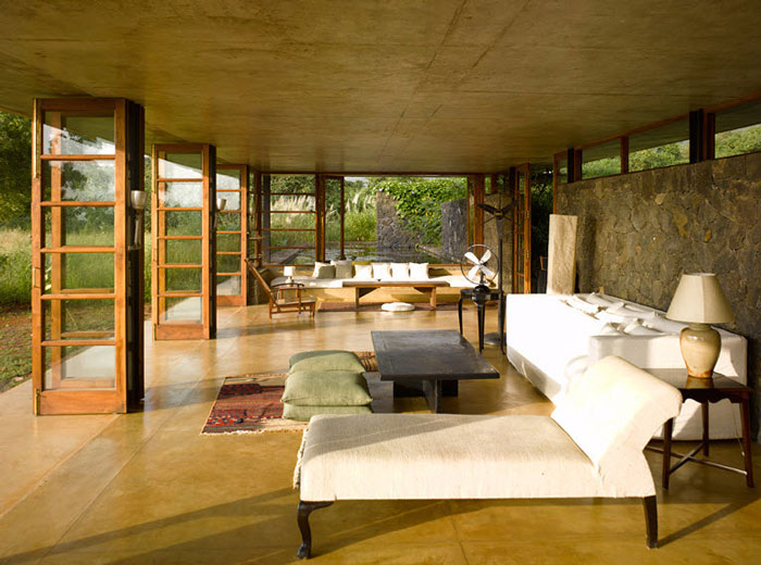 I love the sun burning in from outside, and the calm, colorful shadows of the interiors. The concrete house is amazing, and strange — it doesn't look heavy. More like origami than tons of grey weight. The ceiling of the indoor/outdoor living space is perfect. I'm not sure why, it just is! It could be the line of horizontal windows at the back, keeping the stone wall from overwhelming everything.