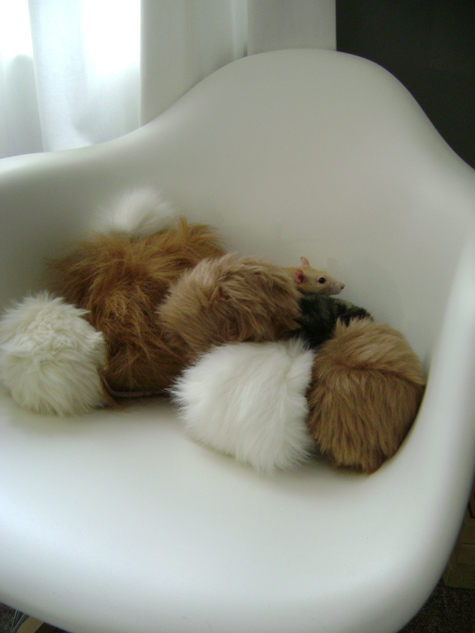 “This is my sweet fancy rat Nim, playing in a pile of tribbles on our Eames rocker. Sadly she passed away yesterday, just days after this photo was taken. We miss her so much!”
