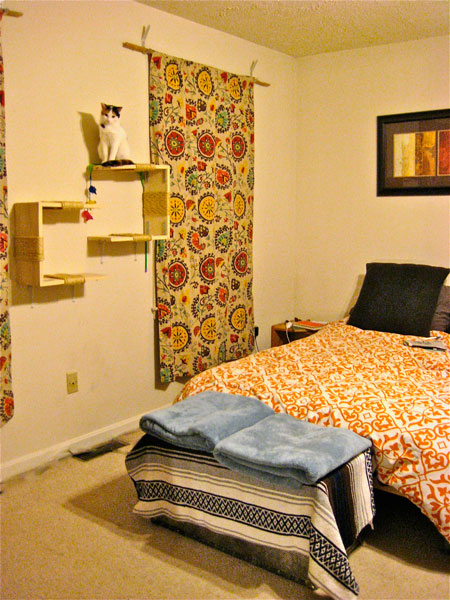 “This is my kitten Pickles, lounging by the corner windows on my screened in back porch. She’s a crazy one, but so deceivingly cute. The second is Pickles perched on the shelves my boyfriend and I built (inspired from a previous post) and installed on our bedroom wall.”
