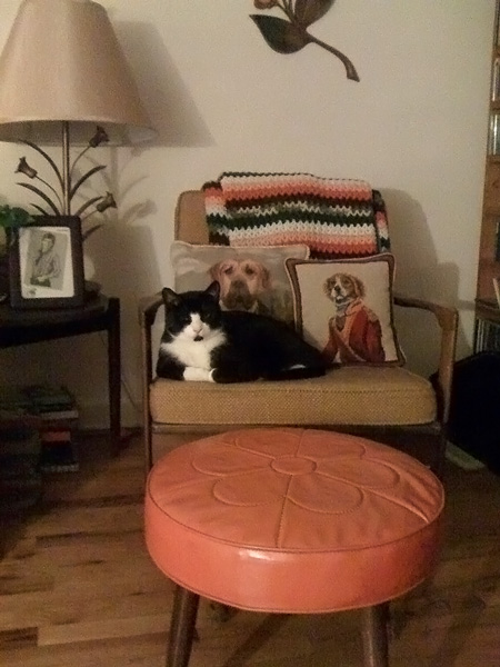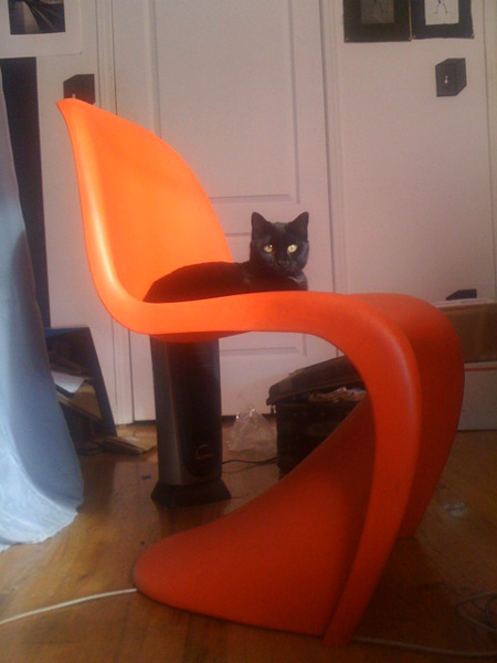 “This is Ptolemy, who I found as a stray kitten here on the streets of Brooklyn. He likes sitting on this chair so he can watch me sitting on the couch.”