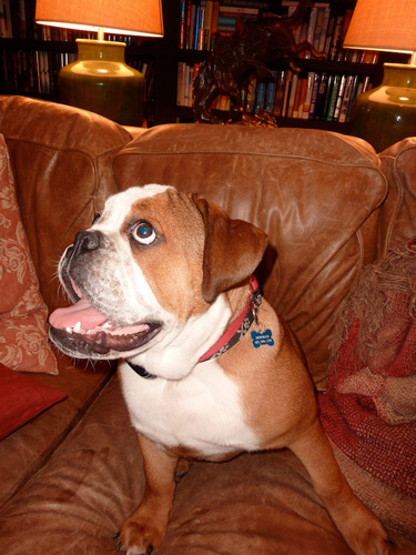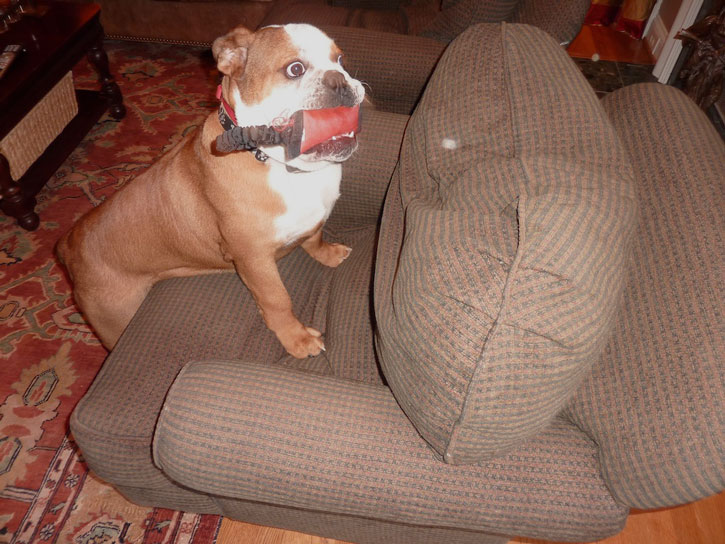 Our 8-month-old (and 95 pound) bulldog, Newman, likes to play in the den, jumping from chair to couch in virtually the same stride.”