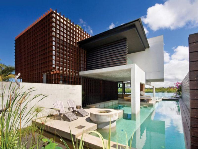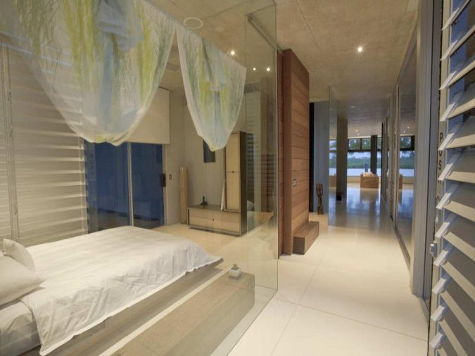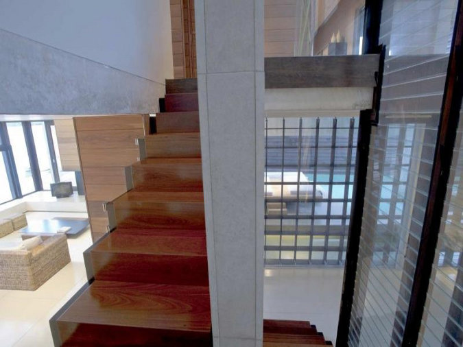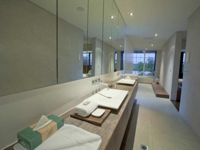 Beautiful architecture! love the woodwork hugging the building!.. and that spacious bathroom is just wow!