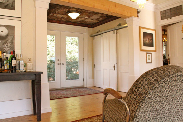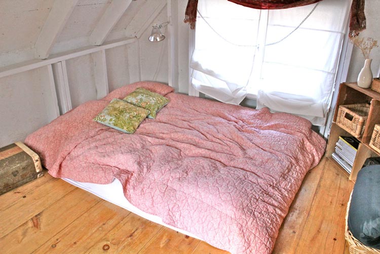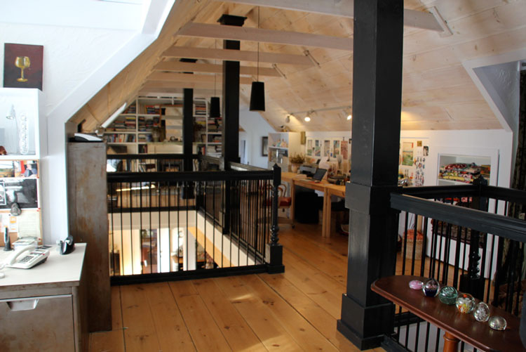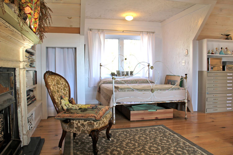 *The completely open studio level upstairs contains four dormer nooks for creative space or sleeping guests, plus a long studio/gallery with railings overlooking the main level. At the far end, floor to ceiling bookshelves rise up 10 feet over an antique gas fireplace insert and mantle. Rolling bookshelves along the sides provide access to generous under-eave storage.*