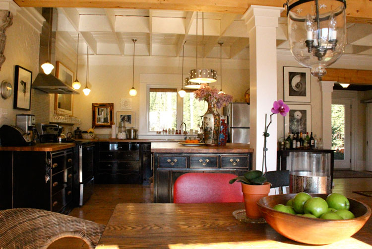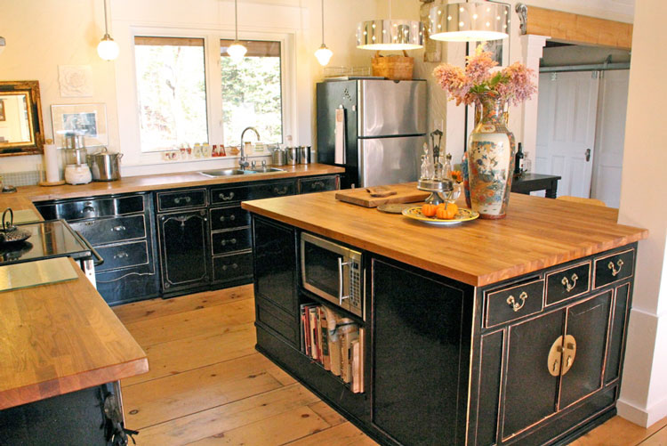 *The cabinets in the custom kitchen are recycled antique chests-of-drawers, buffets and display cases, refinished and integrated into counters and an island with butcher-block tops.*