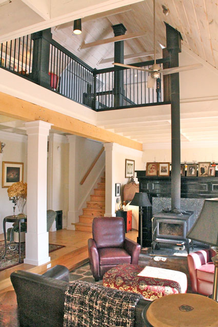 *The lower level is built around a sunken living room with a long bench seat in the window for reading and afternoon siestas. A wood stove is the warm heart of the house; a stone floor provides rustic character. The space is open to the studio level above.*