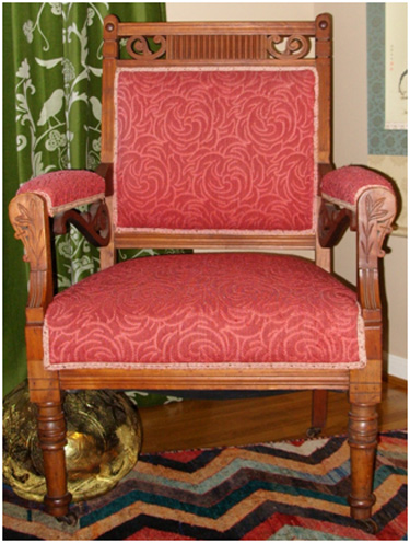I’ve got a little before & after for you all this morning. It’s from Sandra, whose dining room and den we’ve blogged in the past. She had an antique Victorian chair redone and wanted to share it with us. I absolutely love the fabric she selected – so fun! Thanks Sandra!