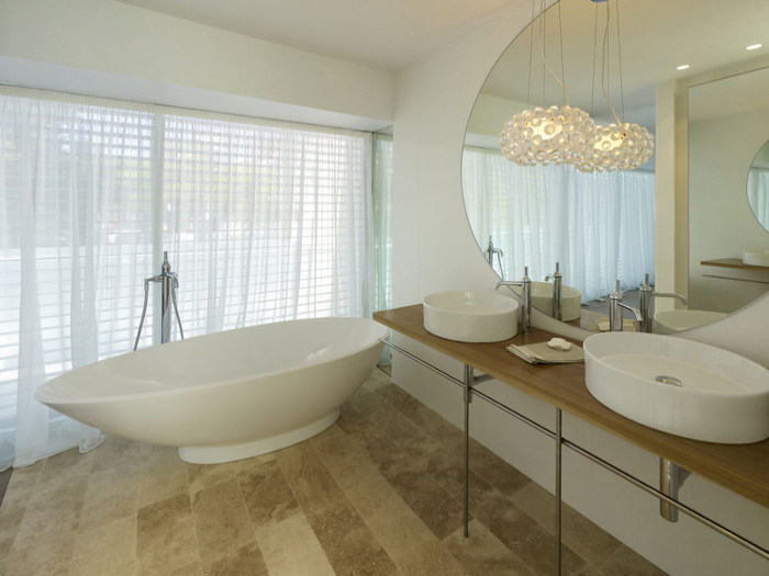 Stunning. I love the living area and the stairs. And that bath! I WANT that bath.