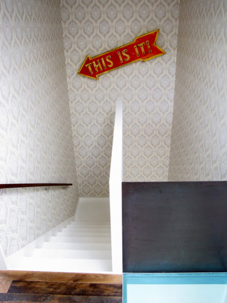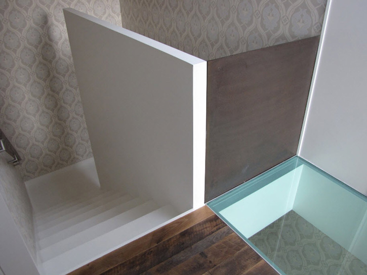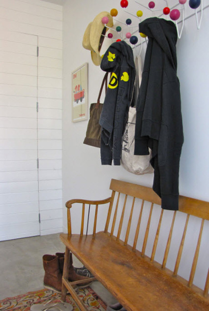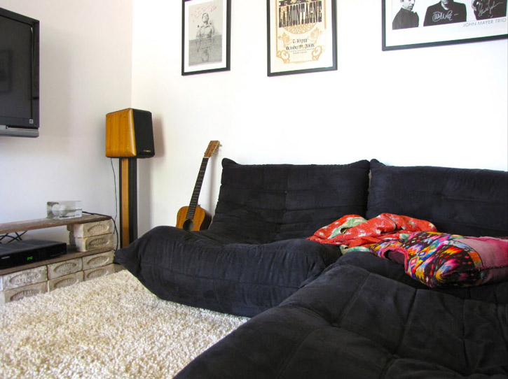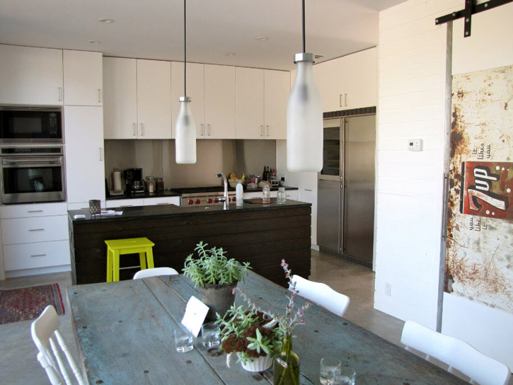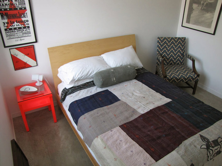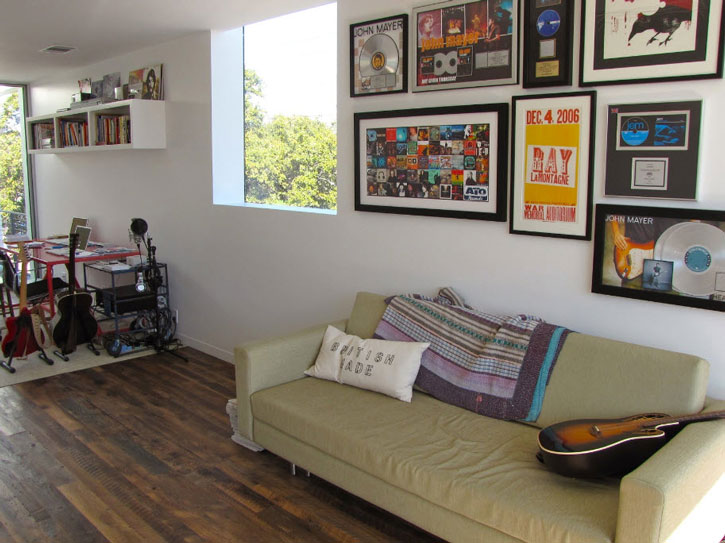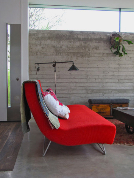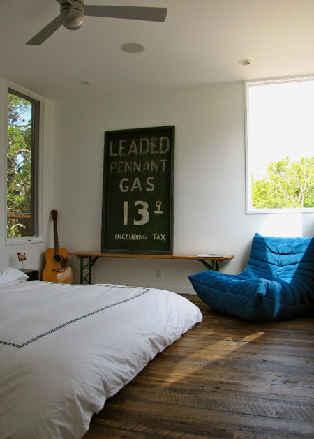“we live in the south austin neighborhood of bouldin creek, a 20 min walk to downtown…we measure our proximity to everything by walkability since my husband, sam, spent 16 yrs in nyc prior to moving to austin at the end of 2008. the house is about 2350 sq’ and we both work from home so we have an office that occupies one half of the entire 2nd story. we spent 8 months building and around 5 months planning (i should also mention we finished the project two months ahead of schedule AND under budget!). the house is a three bedroom/three bath. we worked with the incredible architects at alterstudio who took the time to filter through our ideas, carefully considering how to incorporate our wild eclectic wish list – glass floor, reclaimed wood, loads of outdoor space, lots of windows, energy efficiency, a home office and music room and of course, a pool – with our desire for practical and efficient use of space – we wanted to interact with every room every day and not waste an inch of space – and transformed these components into the perfect expression that is our home. the result is a wonderful modern structure that feels welcoming not severe, fits seamlessly into our funky South Austin neighborhood, merges the indoors with the outdoors and provides us with a home comfortable for two (plus dog). i think the best part about our house is the light. there is so much sunlight that streams into every room and we refuse to get any window coverings. the glass floor actually serves a purpose – it allows light into the downstairs hallway from the skylight and a transom window further carries that light into the downstairs bathroom. given that this is texas and the heat in these parts is serious business, the majority of the glass faces north and south, passively heating in the winter and NOT in the summer. the one room people flip out about is the 9×9 TV room, or TV cave as we refer to it. we designed the room to perfectly fit ligne roset’s togo sofa and is the only place there is TV in the house. a large sliding door closes it off from the kitchen/dining room. most people who visit think it is our pantry.” There is so much I love about Anne’s home – I HAVE to show this post to my architect. Thank you Anne! Consider me inspired!