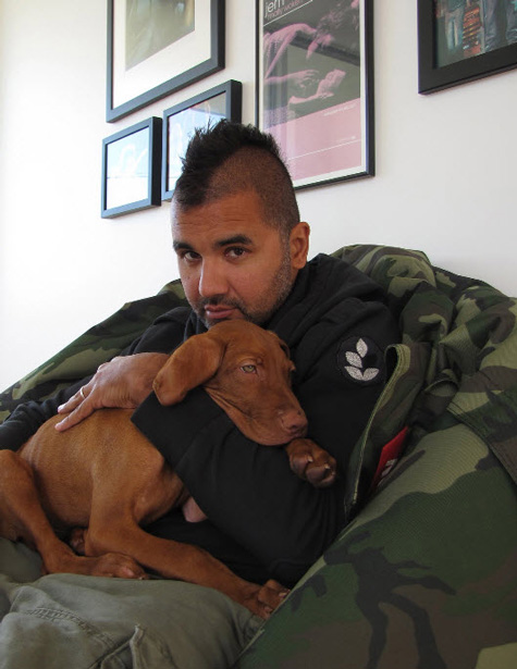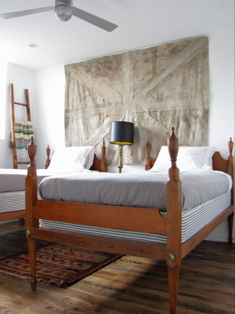 This home is over the top. Everything is spot on brilliant, from the concrete board formed wall, to the uber cool Piet Hein Eek-esque planters near the pool, the spoofy staghorn fern "deer-head' mount, to the antique painted Mexican door dining table, the office space, to the husband to the pup. Beware! I could easily move in.