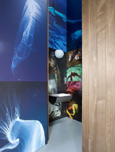 at last i've found the bathroom of my dreams… any idea who designed the cork mirror? i've been collecting corks for years but had never thought of using them to surround a bathroom mirror. sending this link to my architect and buying a glue gun tomorrow.