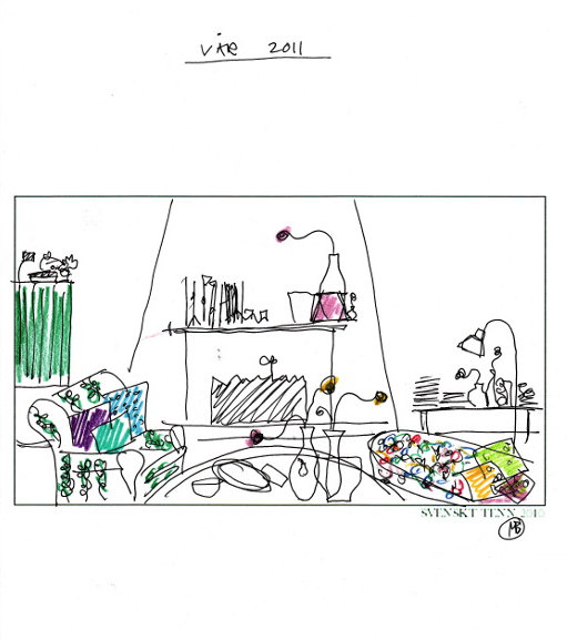 Stylist Mikael Beckman recently shared with us a taste of Christmas (here) at Svenskt Tenn. Now spring is on the way so with a few simple but stylish changes Mikael brings in the promise of the new season. Love his concept sketch. A quick, free and easy style that conveys the message perfectly.