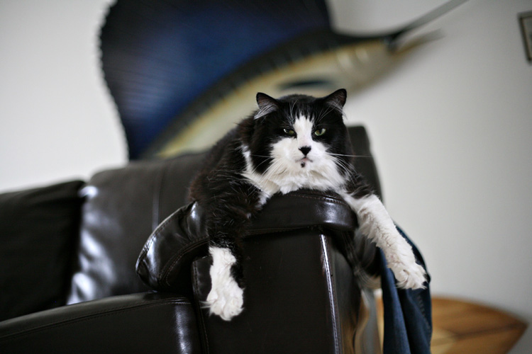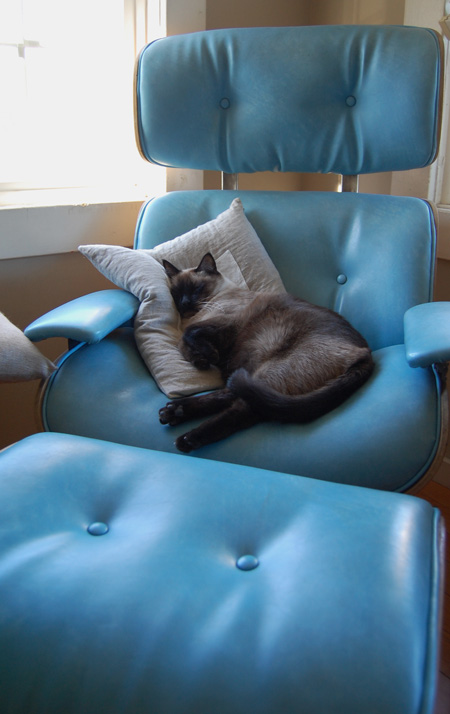 Here’s a photo of my cat Dodger on your Eames repro lounge chair. He has mastered the art of lounging.
