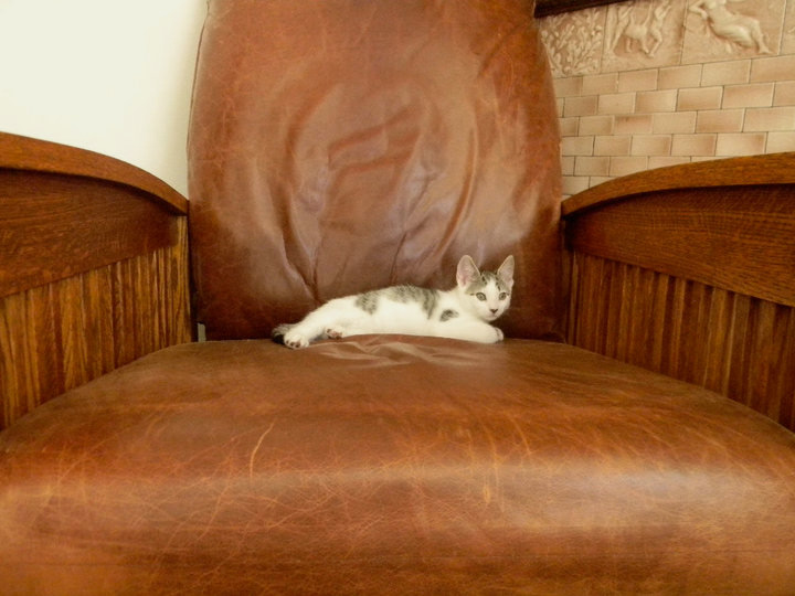 I bought this chair at a yard sale for $25! It is huge, the leather is soft and worn, and it sucks you right in. It has become the coveted seat in our living room, especially by my new kitten Mae who sleeps there most of the day.
