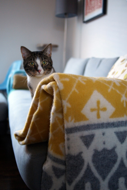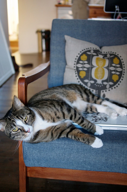 Thought I’d share these photos of my 2-year old tabby cat, Yoni. In the first one he’s on my Habitat sofa with a Primrose & Plum lambswool throw blanket, and the second is a vintage Danish chair we’ve re-upholstered and re-varnished, with a Roddy & Ginger cushion.