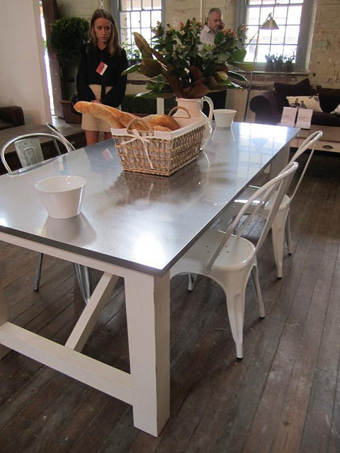 i feel an idea coming on! that gorgeous white farm table with stainless top. i could replicate that on my ikea scratch and dent. now i just need two white tolix chairs to go on the ends!