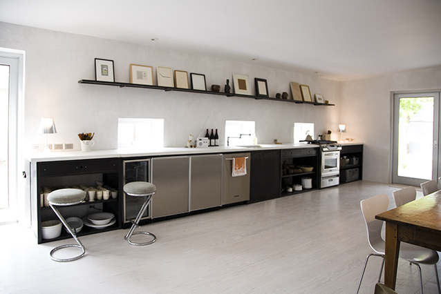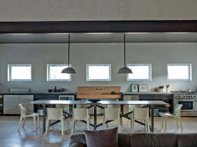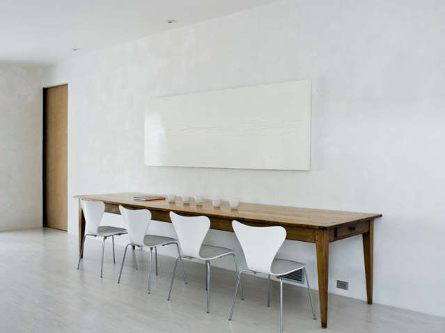 Ok so there are two kitchens that go lengthwise against a wall with no uppers. I have doubts as to how their form compliments their function, are these kitchens a pleasure or pain to prepare food in. Its fine if the kitchen is there and not used much but minimalism is not just about looks, at best it is about the ease and clarity with which we can live without excess of stuff around us. The second kitchen against the wall also places a large dining table against a wall, we all know that is a faux pas, its not nice to stare at a wall, it should be in the middle of the room, and some furniture is designed to be mobile and it is its feature and strength, that table is not a table that is designed for lugging into the room and then back against the wall.
