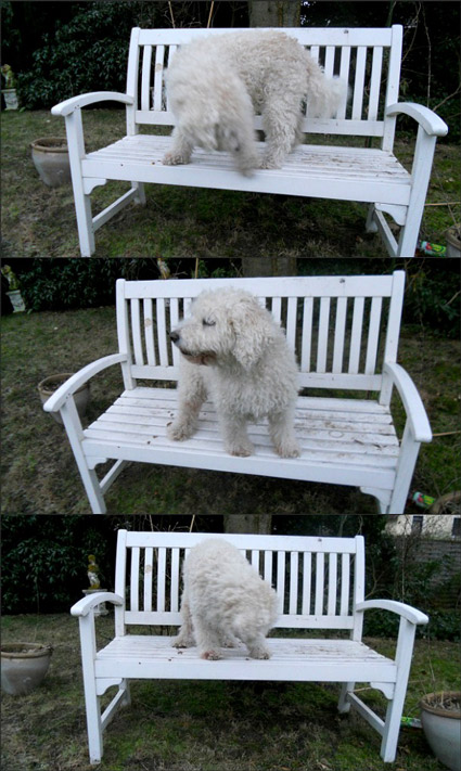 Trying to photograph my Spanish Water Dog on a bench. He is extremely camera shy so it took 40 unsuccesful tries, very cold gloveless hands, and a dog in a bad mood. Of course, whenever I do not bring my camera he sits leisurely on this favourite bench of his!