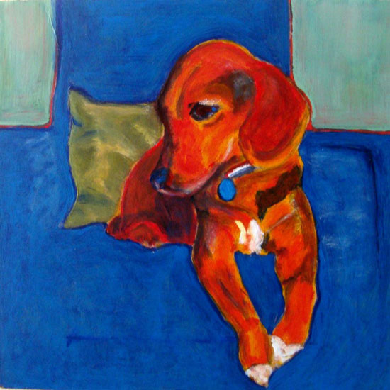 While reading your blog, I discovered your “Pets on furniture” articles and thought that it would be interesting to introduce you to Valerie Mayan. Valerie is a french artist really interested in animals and paints portraits of them. She chose an image of your “Pets on furniture” article and painted one of them. Valérie is used to work this way : She recieves a picture of an animal, the owner tells her which kind of colours they like and Valérie paints it. So if a reader is interested by her work they just have to send her an email at the following address : valerie.mayan@gmail.com and they may also visit her website: www.valeriemayan.com