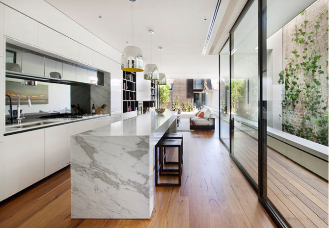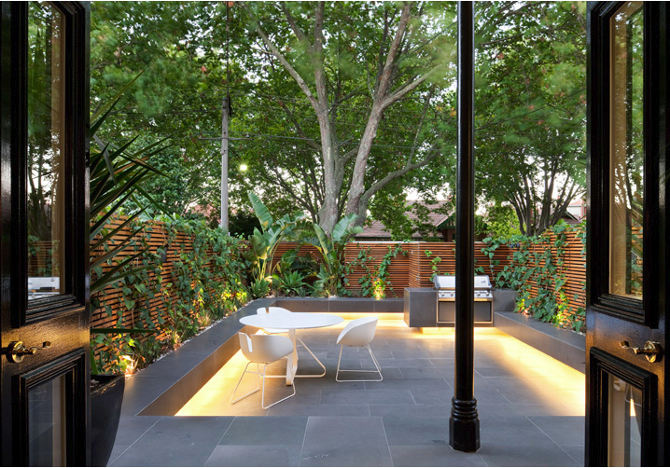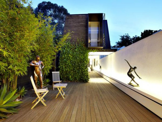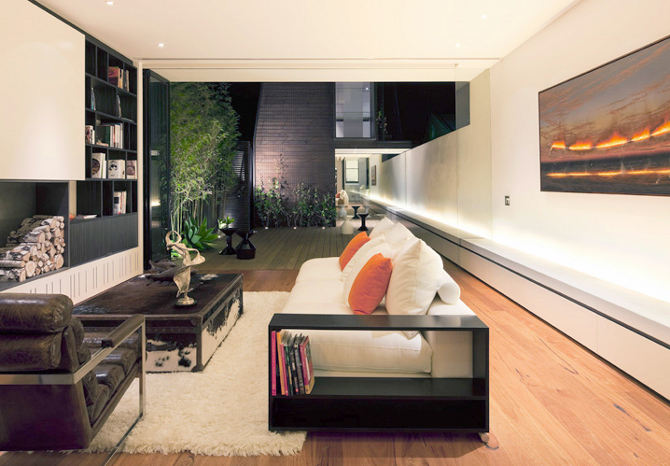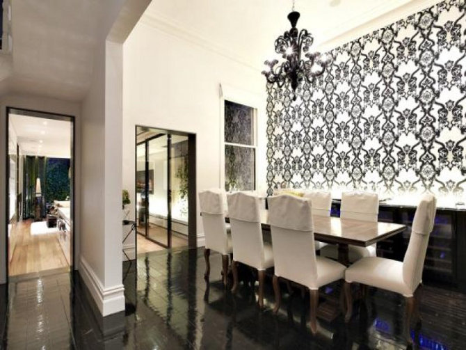 Found something interesting when stalking this week. Architect designed renovation in St Kilda, Melbourne. Spacious modern extension, lovely courtyard garden leading to a rear garage/studio. Architect Matt Gibson. A quick click over to Mr Gibson’s website and there is the house again but just a little different (after the jump). The rear is still the same (minus the modern stools, statues now complete the space). The family/TV room is still the same. Kitchen stools have changed but the bowl on the counter is still there. The biggest difference is the dining room. Chalk and cheese. Black and white. Definitely not the same. Not even the same taste. Then there is the striped living room which doesn’t appear at all on the architect’s site or fit the vibe of the house as depicted on Gibson’s site. We do though on the architect’s website get a chance to peek at the lovely front courtyard garden. So what has happened between the architect taking photos for his portfolio and the real estate agent snapping slightly blurry photos for the listing? Did the architect not like the client’s aesthetic and did a little editing of furniture and spaces? Has the owner “matured” in taste over the time? After all we all change our minds over time when it comes to our rooms. Is it a divorce and the wife can finally go all girly… still in black and white though? A girl who stalks the real estate listings and spends her time staring through the “virtual” curtains needs to know these things 🙂 What’s your theory?