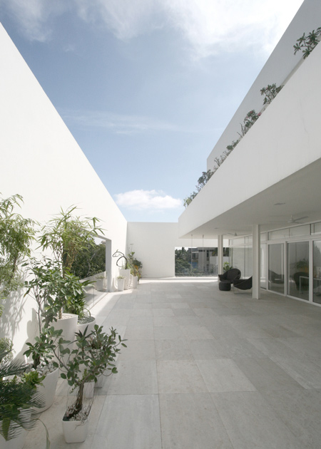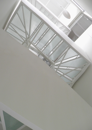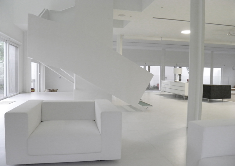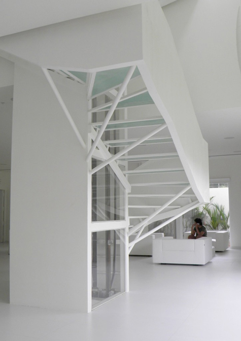 Very interesting! There is a kind of fine-boned quality to the architecture that I love, and to me it keeps it from being too harsh with all the white. The staircase is amazing! I can imagine that it looks different throughout the day as the light changes. What I don't get is all the ratty plants? I would prefer some big, sculptural grasses.