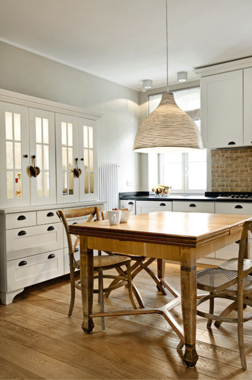 Looove the honey tones of the table and mismatched chairs against the white cabinets. I'm also digging the paint color! So serene.