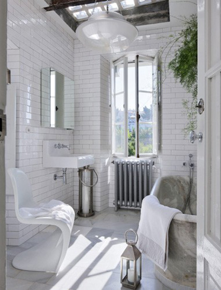 Finally! That truly ugly chair has a comfortable home, beside the bathtub! It actually fits in!
