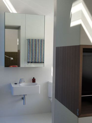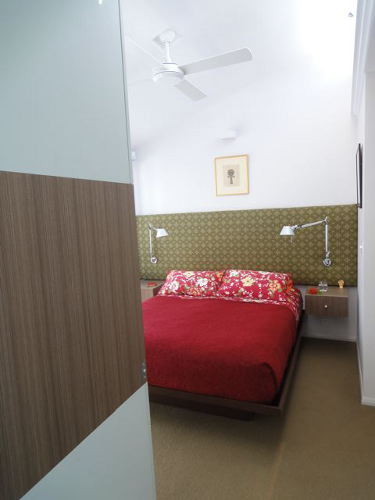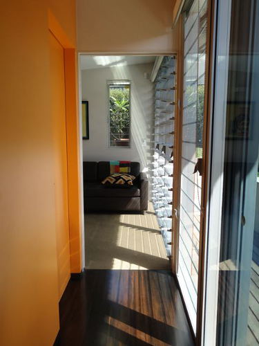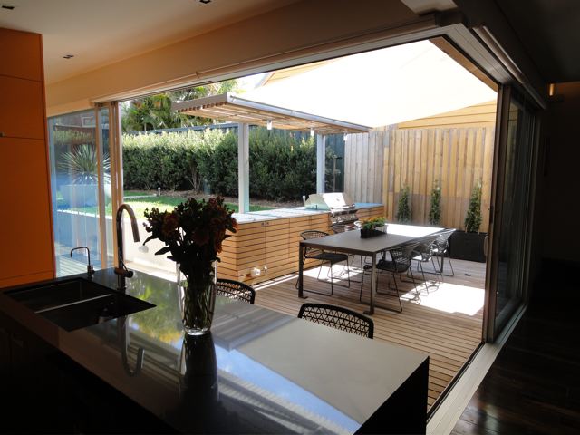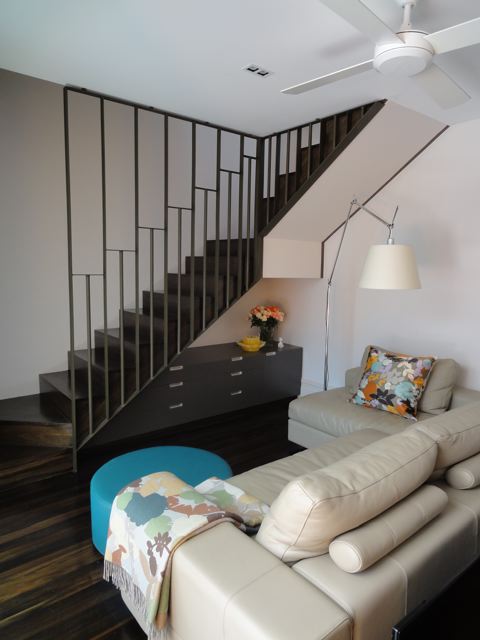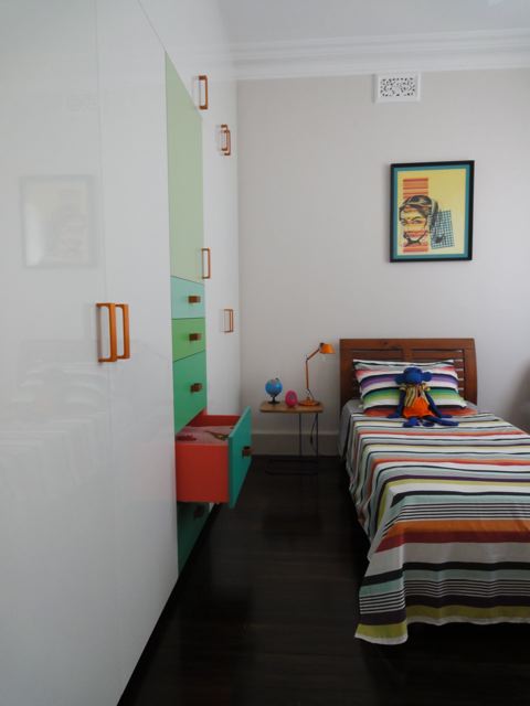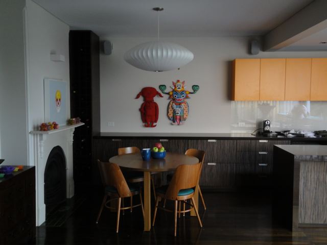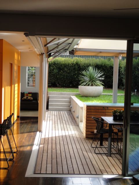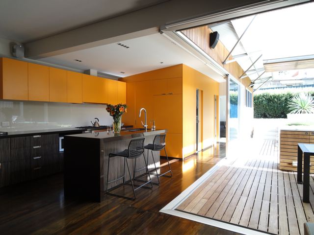 As promised a few shots of my house in Rozelle just completed this week with the steel frame table finally made (steel angles inset with charcoal tiles) and hand-painted this week and elegantly positioned to the outdoor deck. It was nice to visit this week and just have lunch and a coffee with the Client….. pause……..just stop to take in the space……very calming and to reflect on what we have completed. The house also was given a Hindu blessing and I was honoured to take part with the family in the proceedings and the wonderful food that was prepared by the Client’s mother. The house was a fantastic foil to the procession of women and children in silk saris which continually walked past my ‘hermes orange’ joinery wall with looks of great delight on their faces. How to take a sows ear and literally turn it into a silk purse with a dramatic open plan and hero wall in split batten joinery of orange laminate (no greasy children’s hands to scuff the corridor wall). Build in all the joinery and customise the internal carcasses in both colour and functional necessity. Operable commercial aluminium sliding doors and louvers for maximum northern light and clerestory for cross-ventilation. No air-conditioning just ceiling fans and elegant uplighting. Simple hardwood shiplap facade and steel skillion roof lifting to the north and cantilevered 1.2 metres by steel angle outriggers. Select the loose furniture and hang the artwork and choose the ‘kenzo’ and ‘missoni’ bedlinen. A hand in glove match between Architect and Client. Desire to inspire please enjoy the visual feast!