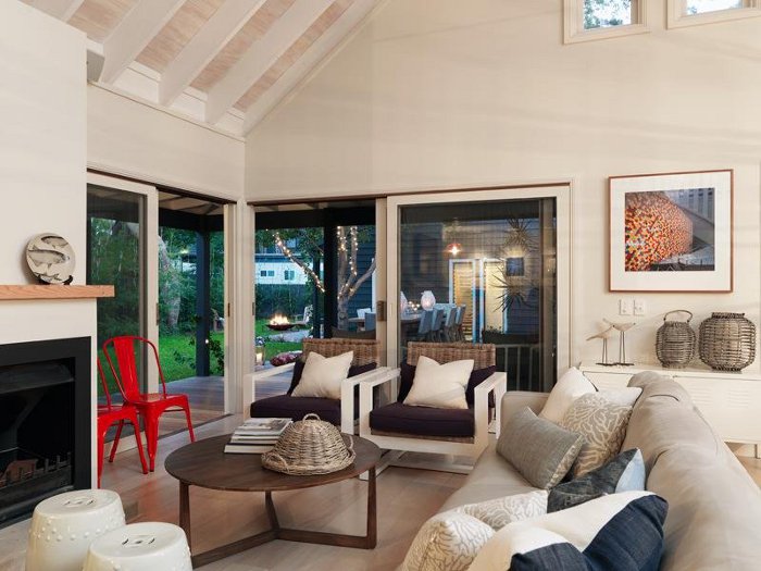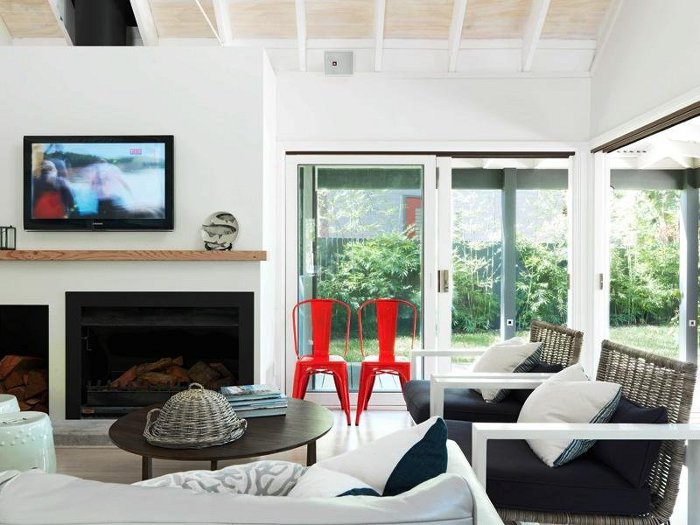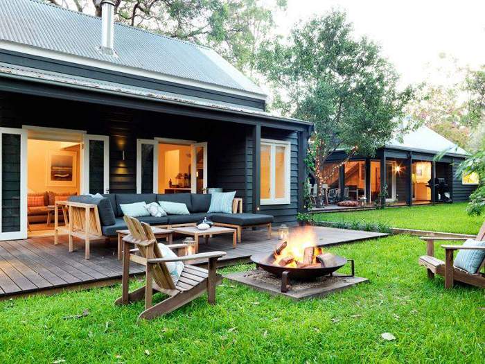 Hi. Thanks for all the wonderful and kind comments on our beach house – you have made our day! My husband and I actually own the house and did the interior decorating ourselves. We empoyed Connor and Soloman Architects to design the decks, interior fireplace, and the outside walkway which connects the 2 buildings (the house and studio are original). Our Builder was Ian Westlake from Pearl Beach.