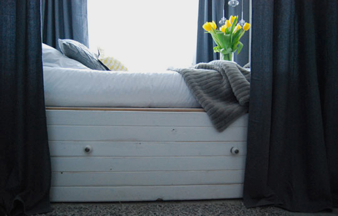 So I have pulled my socks up and I have first built a complete bed… It looks like a platform covered by a parquet floor bleached in a scandinavian way… and he has now a huge drawer to put in all his stuffs… (around 6*6 ft)… To make it cozier I have installed two wool curtains,… He has told me when he closes them, he feels exactly like he was in a boat cabin… and he really likes boats… so a good point for me !