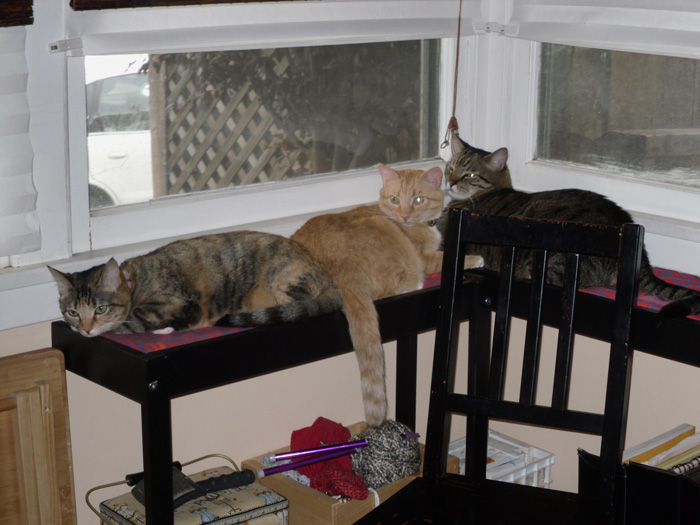 I recently rearranged my apartment and moved the couch to the other side of the wall. This left the my cats with no way to look out the window. Came across your solution and did the same, Thanks again. Who would know that a changing bed could become a cats heaven. I have 3, Al (the big one, part bengal, in the pic), Mini (orange tabby) and John Wayne Woo the Chicken Little Beans aka beanie, peenie or wee (calico and long story on name). Below are a few shots of them loving the new perch. I made it last night. They didn’t understand the purpose until this morning. They have been happily sitting and sleeping all day.