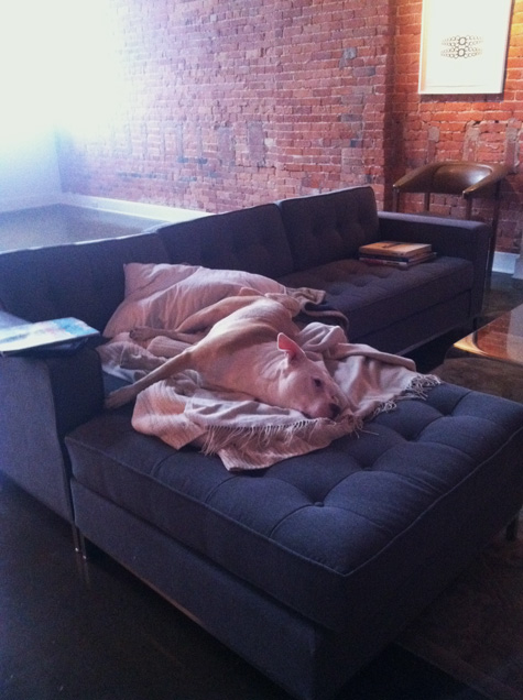 This is Malone, my approx. 7 year old rescue pit mix, making himself comfortable on my Gus Jane Bisectional.