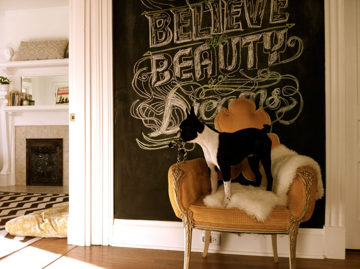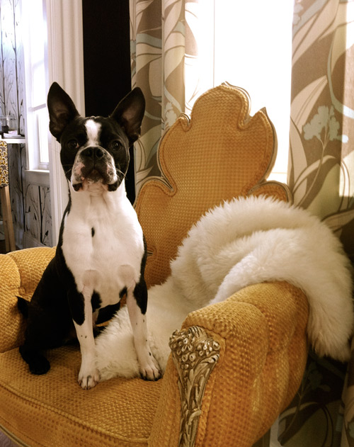 This is my Boston Terrier pup, Suge, on my favorite chair. The yellow armchair is my favorite in the house – an unidentifiable leftover prop from a TV shoot last year. Suge is our energetic 6-month old Boston. I would say he loves sitting in the chair, but I think he’s more into the height it gives him for toy hunting.