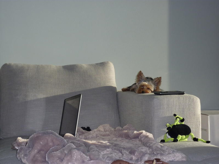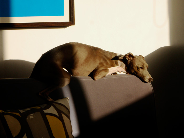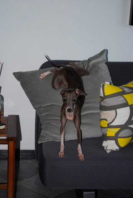 Our italian greyhound Flaca, at different stages of relaxation on one of our sofas.  ; )