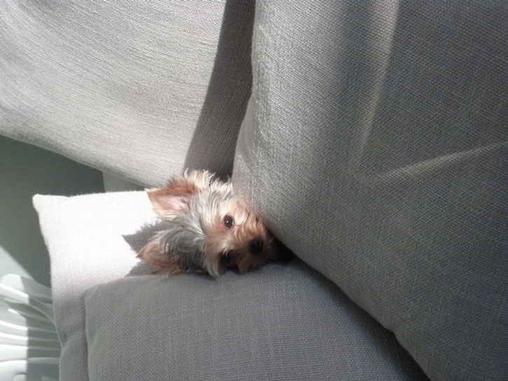 Ollie, our 1year old yorkie, loves to take a nap on the couch…he also loves to hide from you behind the pillows.