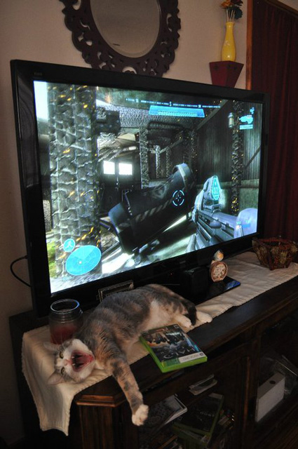 Our darling Sophiecat decided to perch in front of the TV and mess up my husband’s gaming time.  Caught her mid-yawn…she looks ferocious!