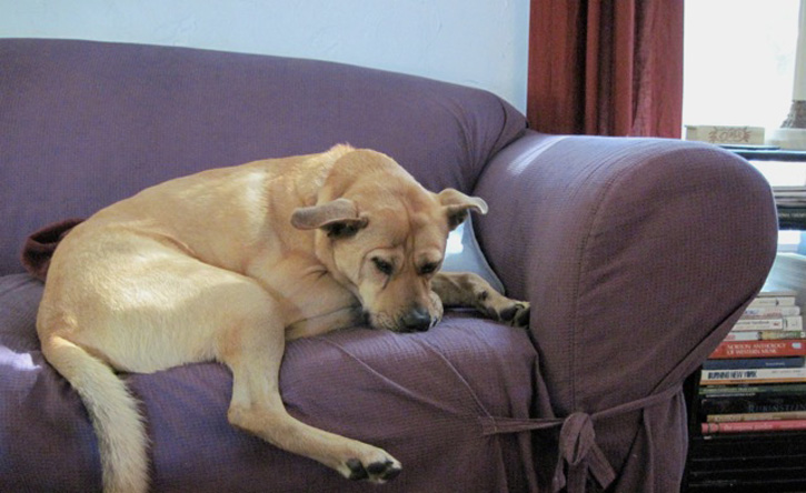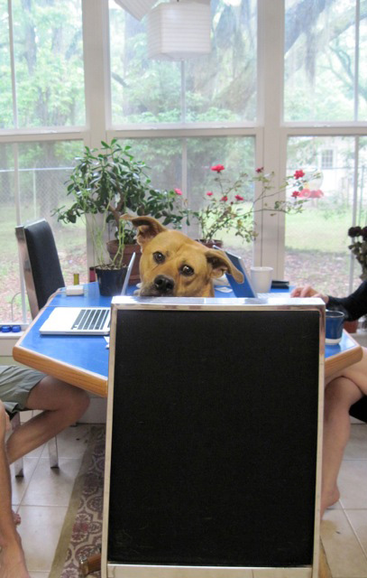 This is my Florida brown dog, Pax, first having breakfast with us.  He’s peeking over a re-upholstered vintage dining chair.  And second, lounging on our slip-covered couch.