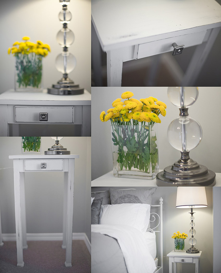 I refinished these small tables myself a couple months back. They were espresso brown with boring knobs, so I painted them a warm white, antiqued them a bit and found some great new hardware. Simple, cheap, effective 🙂